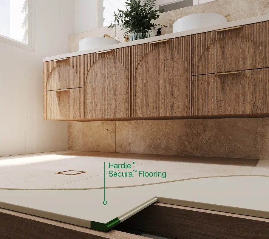 Hardie™ Secura™ Flooring is a durable yet lightweight structural flooring that can be installed over timber or steel floor joists and can contribute to a 7-star rating. Hardie™ Secura™ Flooring is the ideal wet area flooring solution. It’s resistant to moisture damage and features a surface sealer to help reduce moisture penetration and means water beads on the surface rather than penetrates.